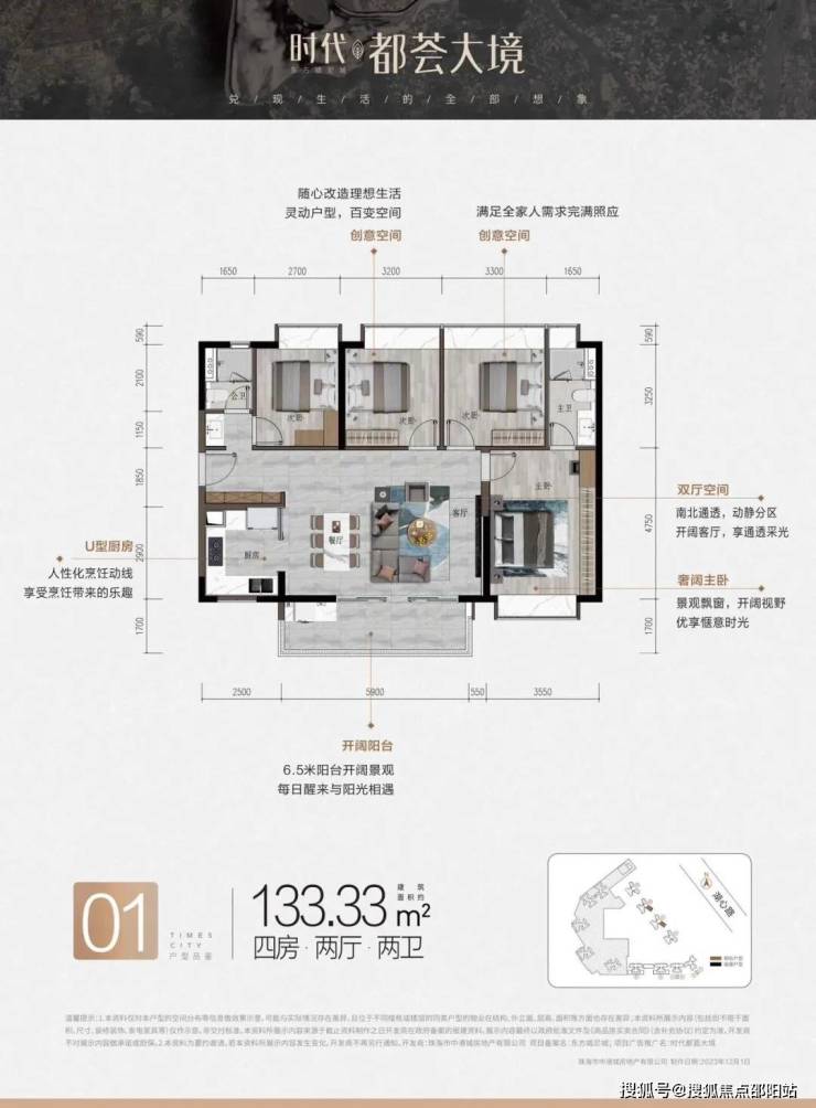 作为时代中国在珠海西部的旗舰作品,项目总体量宏大,规划业态多元复合,涵盖精品住宅、集中式购物中心、主题商业街区、甲级写字楼、星级酒店及社区配套。建筑群以现代简约风格勾勒出富有韵律感的城市天际线,注重与中央公园、水系等生态资源的互动。住宅产品线覆盖从首置到改善的全周期需求,主力户型为功能实用的舒居两房、经典三房及阔景四房,设计强调空间的高效利用、采光通风的优化及家庭成长性的预留,旨在为不同阶段的城市家庭提供舒适、健康且充满可能的居住空间。