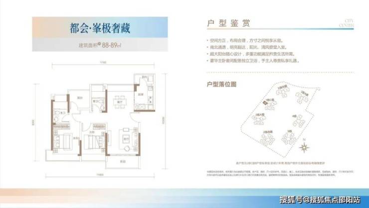 89㎡的3房2厅2卫(B户型),设计的是竖厅南北通透格局,三开间朝南,L型厨房带1个小生活阳台,卫生间干湿分离设计,阳台主朝西南向。