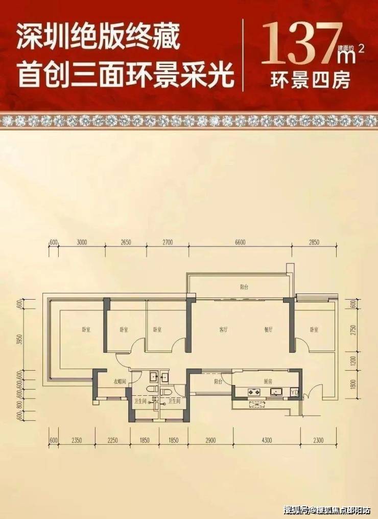 137㎡4房2卫户型:新品大户型,阔绰玄关,大横厅双阳台南北通透,主卧罕见U型窗设计,三面采光,全屋飘窗赠送,约93%超高实用率。