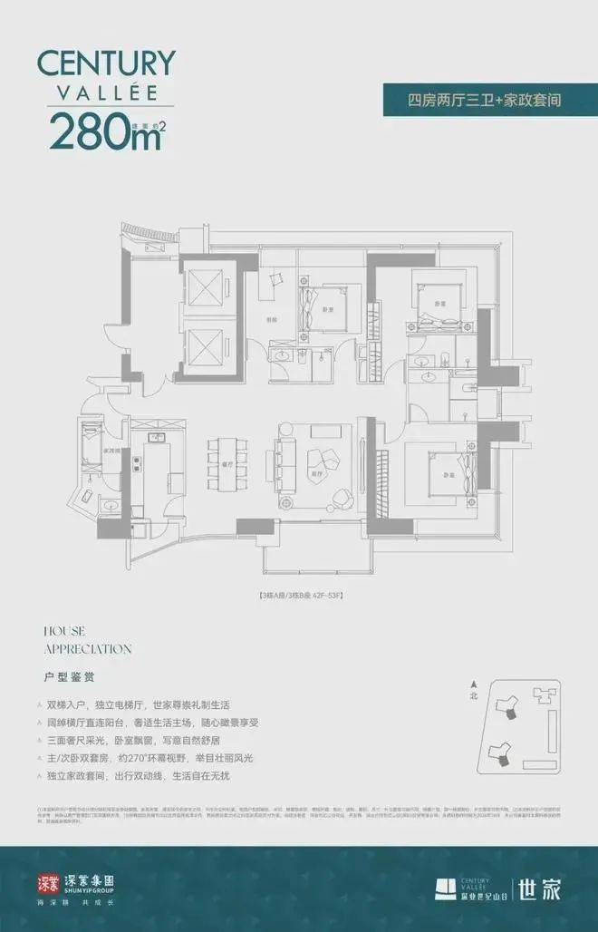 深业世纪山谷·世家主推建面约233/280/386m²纯粹大平层户型,高区还有少量建面约420-1080㎡墅级顶复。