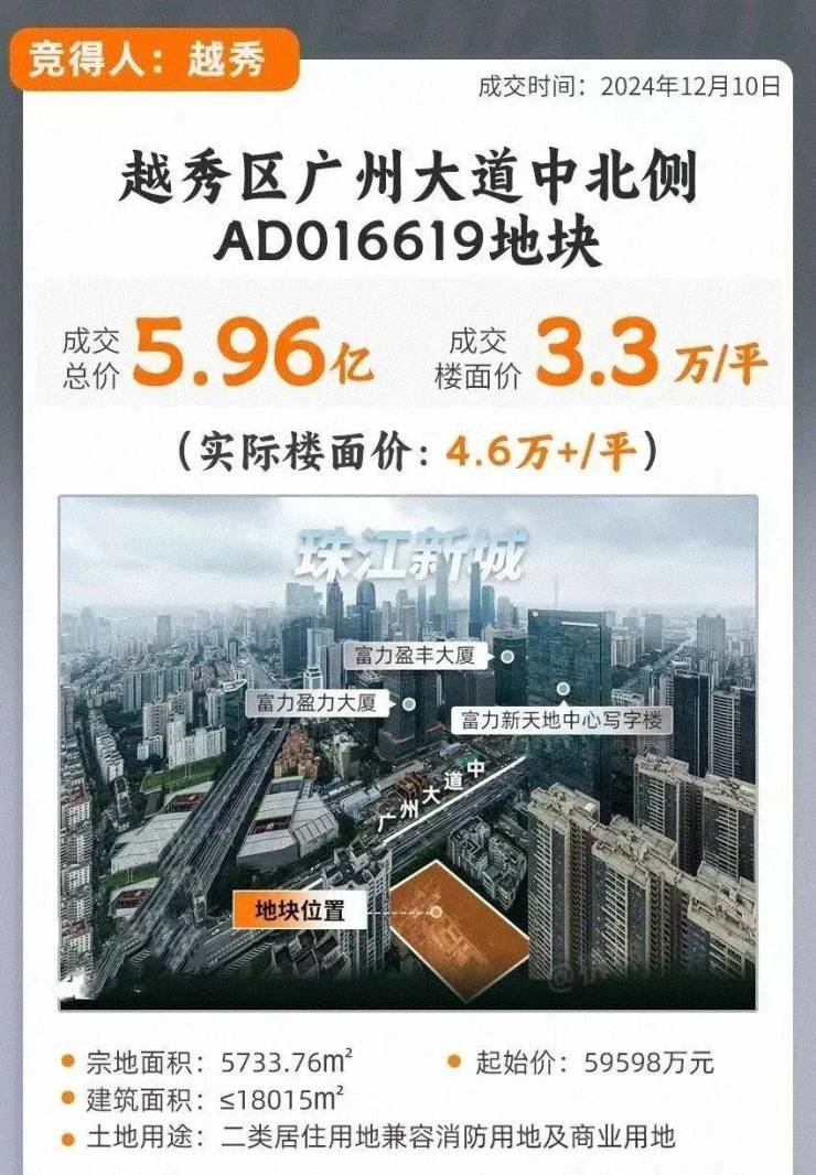2024年12月越秀地产以59598万总价拿下越秀区广州大道中地块,扣除配建后,楼面价约4.6万/平。