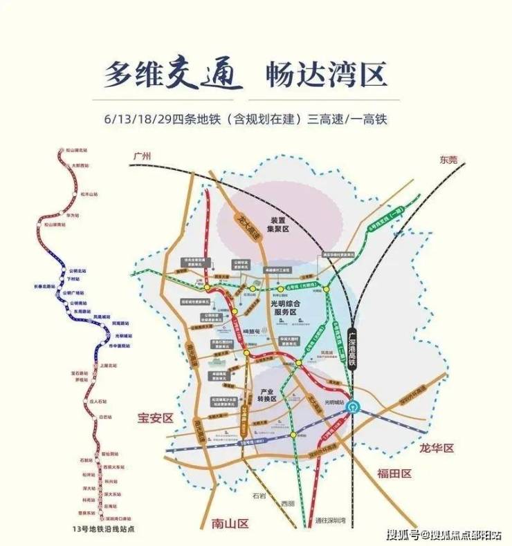 1条高铁/3大高速/4条地铁快速直抵福田/南山/宝安,通达粤港澳城市圈1条高铁:光明城高铁站,湾区门户占位,国家级铁路枢纽3大高速:龙大高速(免费)、南光高速(免费),深圳外环高速;4条地铁:在建地铁13号线东周路站直抵深圳湾口岸-东莞松山湖,6号线连接光明-深圳北-福田科学馆,15站可达福田中心区。18号线(规划):贯穿盐田区、龙岗区、龙华区、光明区、宝安区;29号线(规划):贯穿南山区、宝安区、光明区。立体交通承载区域高速发展,高效通达带动大城繁华。