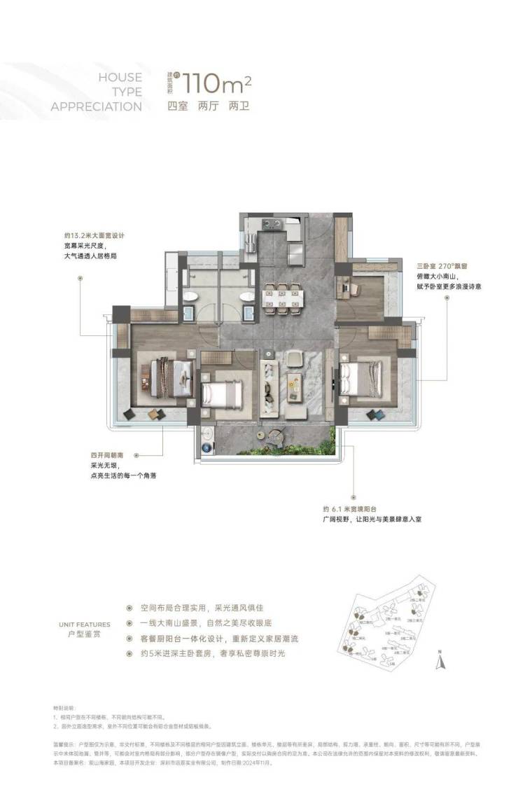 :约 10 万㎡纯住宅社区,无人才保障房规划,匹配高阶圈层的居住纯粹性;建面约 95-110-115-138㎡三至四房,板式藏品户型实现南北通透与山景最大化。