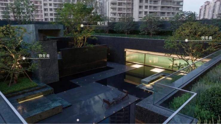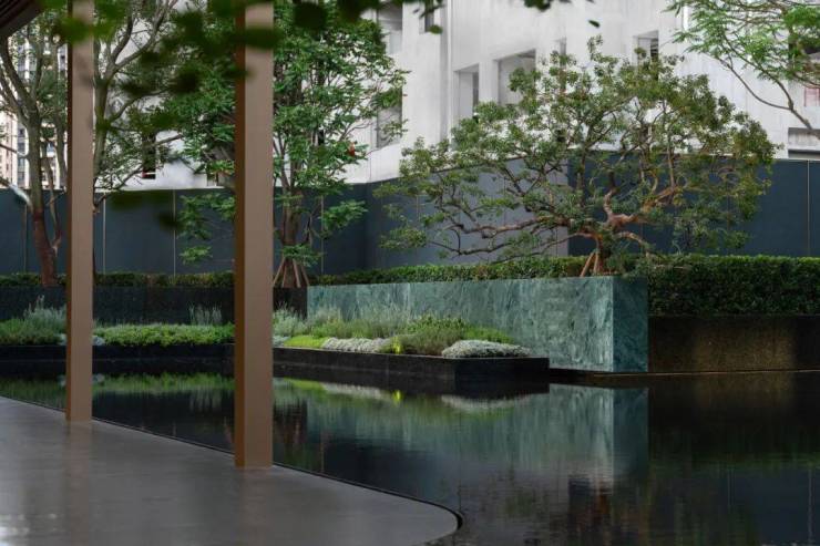 下沉式庭院延续极简有力的留白氛围,局部点缀海红豆、铁冬青,干净纯粹,营造少即是多的意境感,庭院如镜般平静、透彻的水景映出点点绿意。