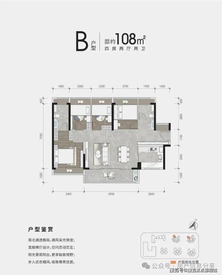 108㎡户型做的是横厅,动静分区,四房两厅一厨两卫一阳台的格局,这种户型最近几年非常常见了,优点就是横厅显得客厅更宽,有宽景阳台,室内通透性略好一些。
