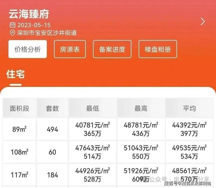 宝安-沙井,特发云海瑧府于2023年5月16日取证入市,本次推出1/2/3/4栋共计738套住宅房源,面积89㎡的3房2卫,108㎡的4房2卫,117㎡的4房2卫户型,备案单价4.07万-5.19万/㎡,备案均价4.58万/㎡,总价365-609万/套,2025年6月份送简装交房。