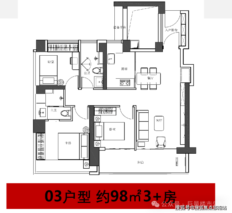 98m²(3+1)户型,带入户,竖厅格局,厅出阳台带新规大阳台设计,朝向整体以南为主,主卧以L型落地大飘窗,大大提高采光率,设备大阳台也是赠送面积,可多功能利用率更好,几乎无对视,刚需首先.