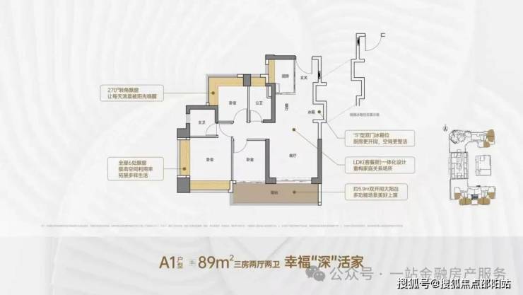 客厅3.5米开间,LDK一体化,客厅连接次卧出5.9米双开间大阳台,次卧270°转角飘窗