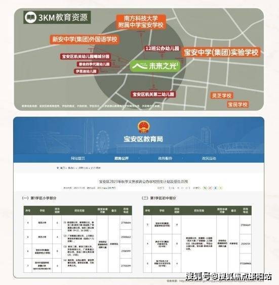 学校配套:自建一所12班幼儿园,南科大附中宝安学校(九年制)1.5公里、宝安中学实验学校500米,