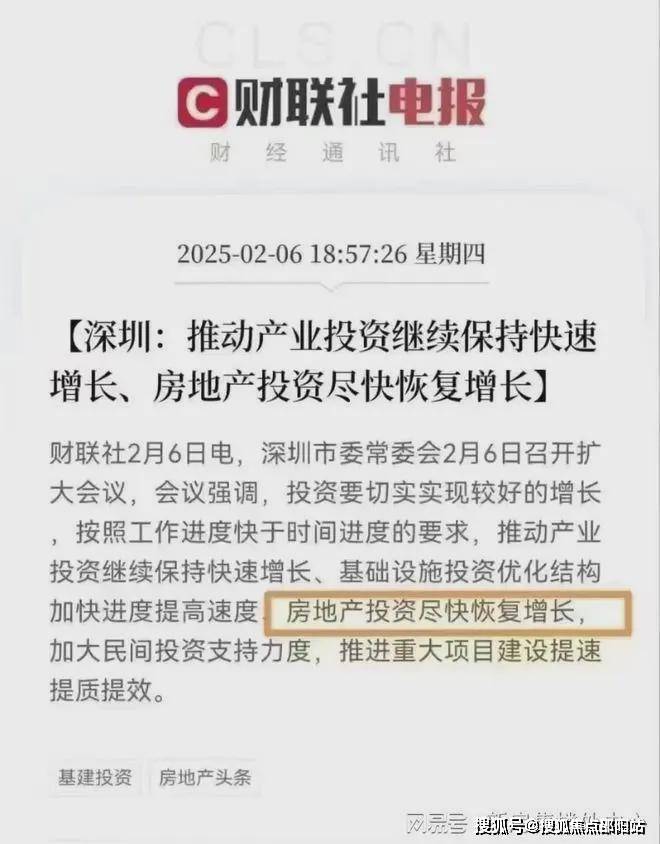 财联社2月6日电,深圳市2月6日召开扩大会议,会议强调,投资要切实实现较好的增长,按照工作进度快于时间进度的要求,推动产业投资继续保持快速增长、基础设施投资优化结构加快进度提高速度、房地产投资尽快恢复增长,加大民间投资支持力度,推进重大项目建设提速提质提效。