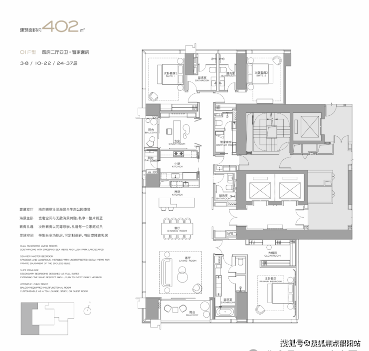 (3-57层)T3栋 四房四卫+家政套间。中西厨分区,餐客西厨一体,带多功能房。端头位置,三面采光。功能完备,房间数充足;实现了主仆双动线;会客观景视野一流。