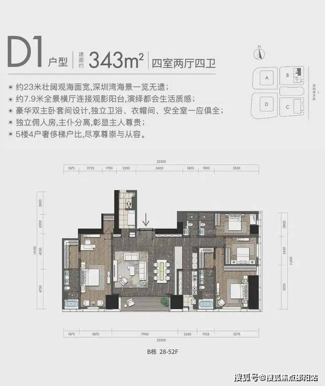 观景阳台:高区340平米户型,东面23米宽无敌海景视野(塔楼总观景面约46米)