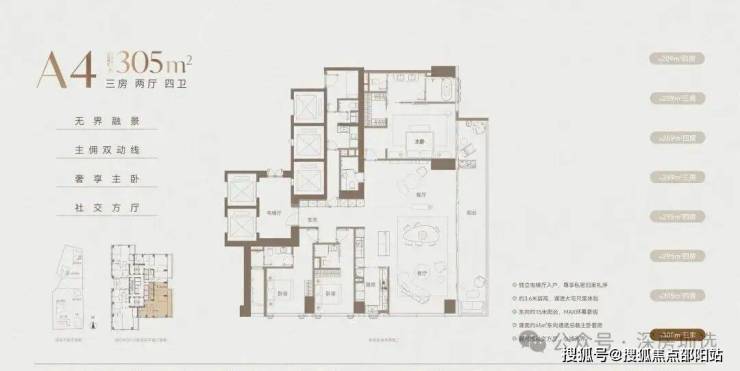②高区42F起(150-200米)是约370-375-403㎡4+1房五卫+家庭厅+家政套间;