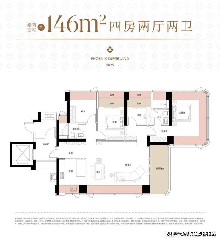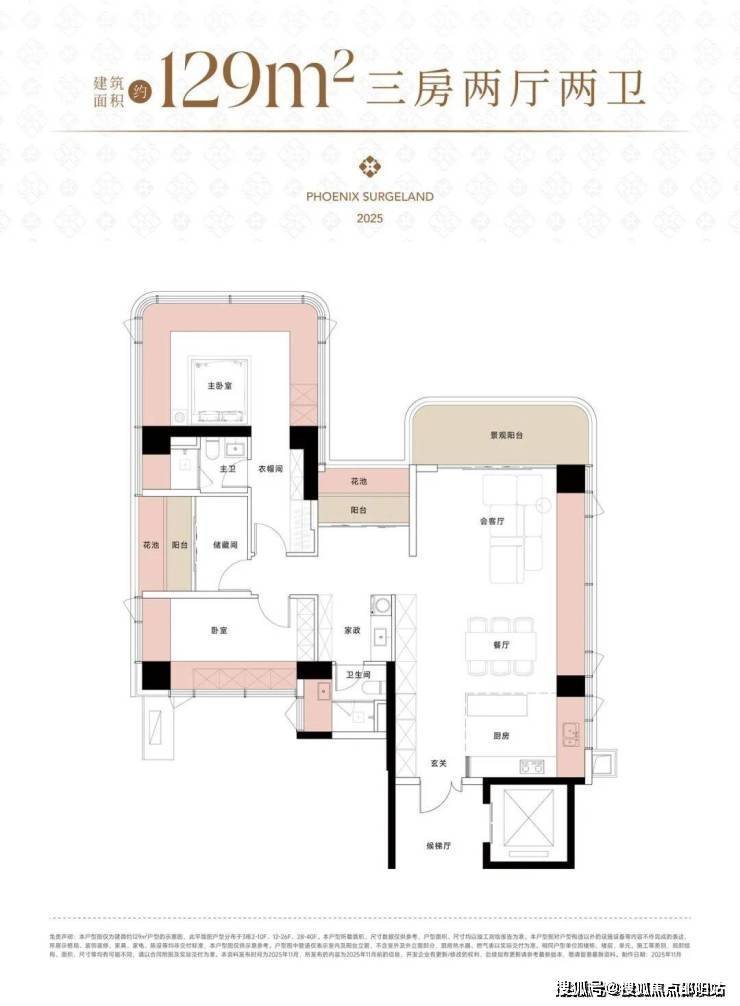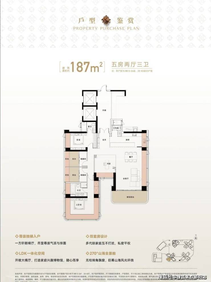 :南北通透,约 7 米观景阳台,主卧套房带衣帽间,125㎡起享专梯专户,私密性与舒适度兼具。
