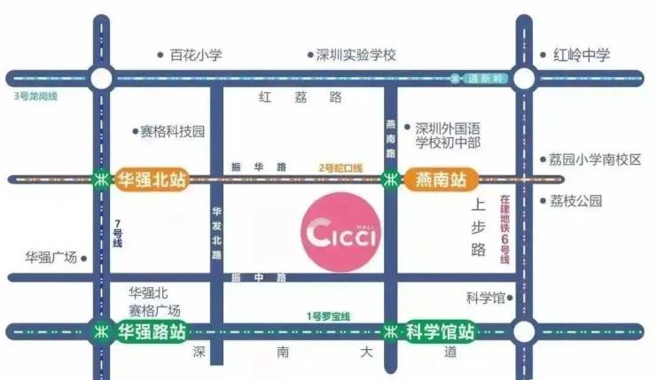 宝树台华玺公馆位于福田重要地段,地处深圳市福田区核心地段的CICCI Mall,南接华强北商圈,西望福田CBD,邻近莲花山公园、笔架山、银湖等自然风景区,地理位置十分优越。从交通上来看,CICCI Mall无缝接驳地铁2号线燕南站,周边汇集1号线、2号线、3号线、6号线(建设中)、7号线、9号线等六条地铁线,700米范围内汇聚9个地铁站出入口和21个公交车站台,数十路公交车经停这些站台,交通十分便利。