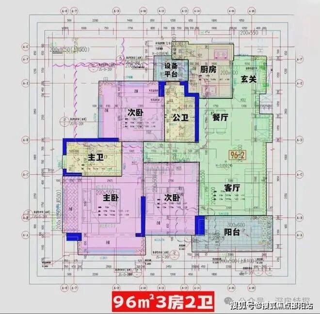 96㎡的3房2厅2卫(-1),设计的是经典竖厅格局,进门入户玄关,客厅3.7米开间,LDKB一体化,S墙设计预留冰箱卡槽位,动静分区,三开间朝南,U型厨房,公卫三段式分离,还带1个设备平台,东南朝向。