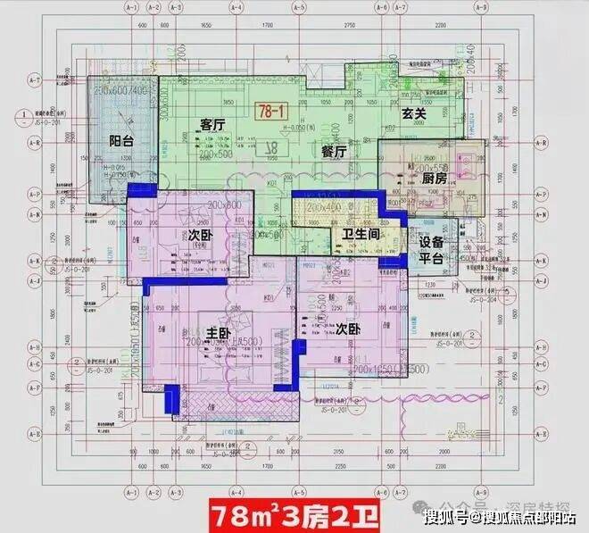 78㎡-3房2厅1卫,设计的是经典竖厅格局,客厅3.3开间,LDKB一体化,S墙设计预留冰箱卡槽位,动静分区,三开间朝南,U型厨房,卫生间三段式分离,还带1个设备平台,得房率约88.34%(包含赠送),西南朝向。