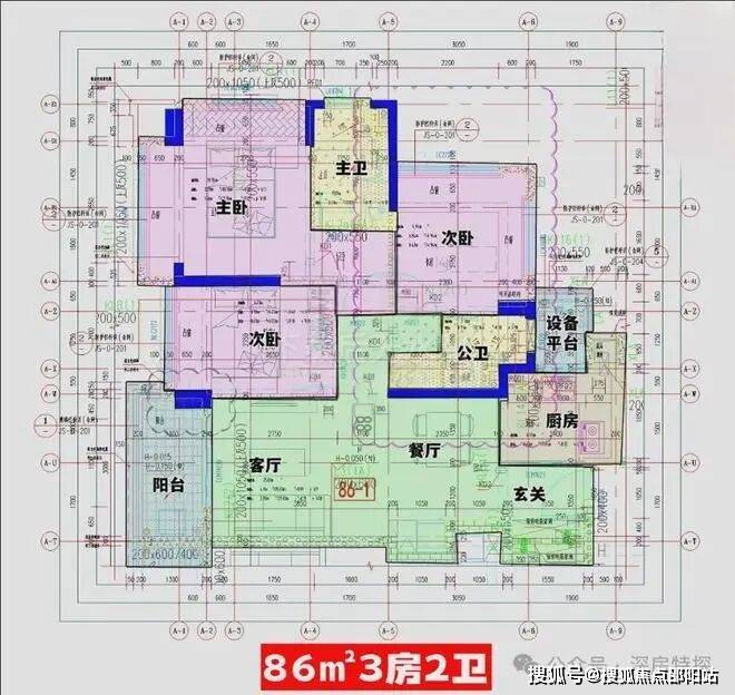 86㎡的3房2厅2卫,设计的是经典竖厅格局,进门入户玄关,客厅3.4米开间,LDKB一体化,S墙设计预留冰箱卡槽位,动静分区,三开间朝南,U型厨房,公卫三段式分离,还带1个设备平台,西南朝向。