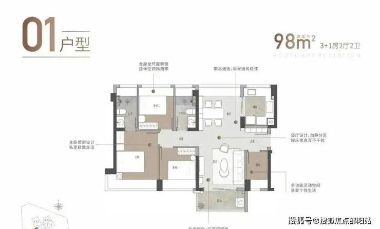 98㎡四房两厅两卫:竖厅南北通透格局,进门独立玄关,四开间朝南。
