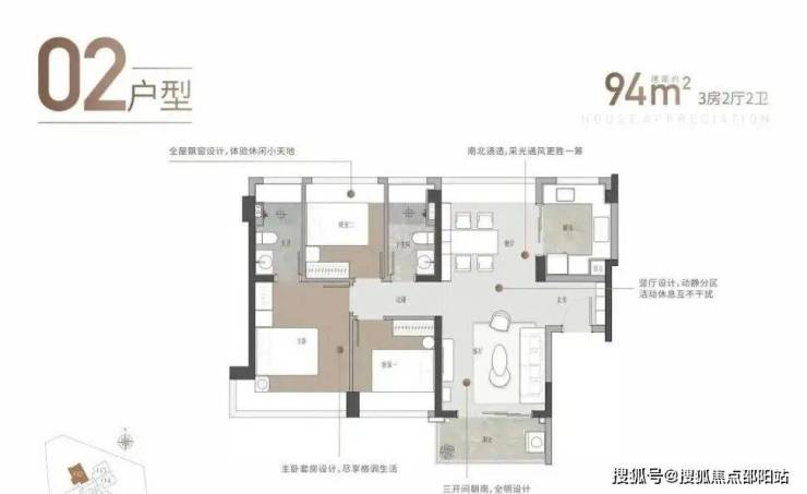 94㎡三房两厅两卫:竖厅南北通透格局,进门独立玄关。