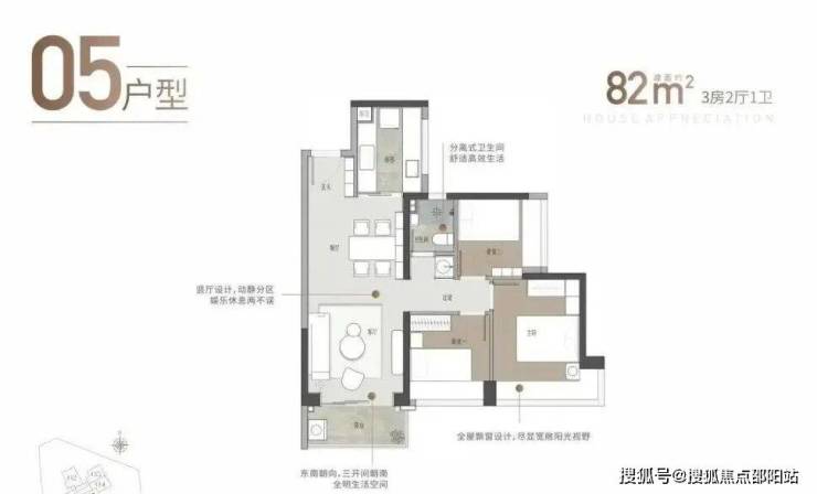 82㎡三房两厅一卫:竖厅格局,LDKB一体化设计,三开间朝南。