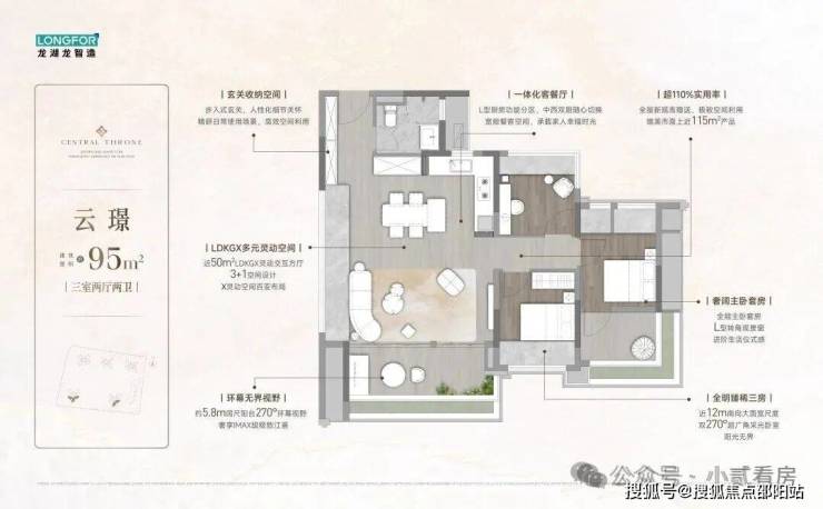 【95㎡】11.8米南向面宽+5.8米超大阳台对流+极致珠江景观+灵动改造三四房随意切换+首置首选 约5.8米超大阳台,5.8米超大客厅开间,近39㎡LDK谁,灵动布局,新潮实用,约5.4米270°环幕观景窗!