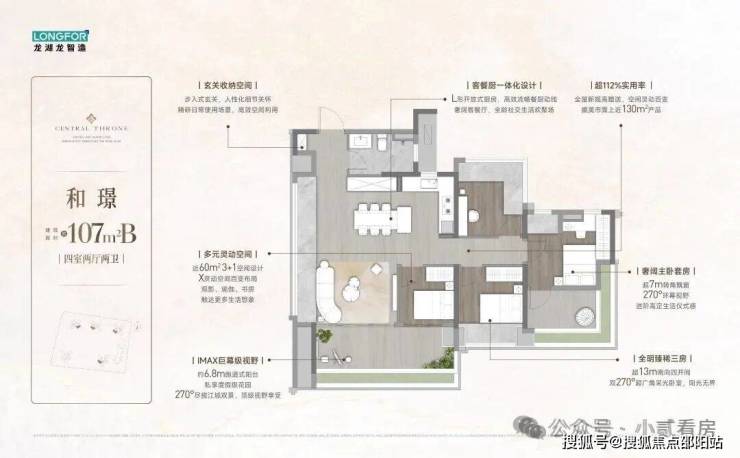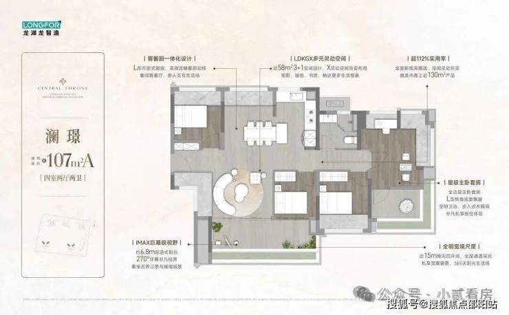 【107㎡】14.5米南向面宽+6.8米超大阳台对流+首创独立阳光女神衣厅+改善首选 约6.8米超大阳台,4.2米超大客厅开间,近38㎡LDK设计,首创独立阳光女神衣厅,新潮实用,约6.8米 270°环幕观景窗,舒居大四房改善必选!