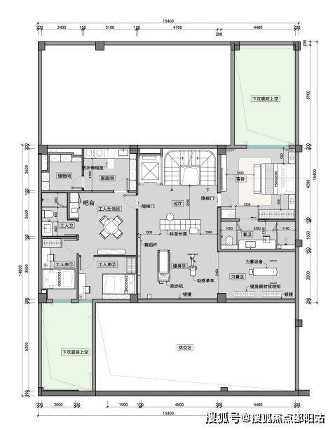 负一层下沉庭院周边环绕健身区、工人生活区与丰富储物空间;