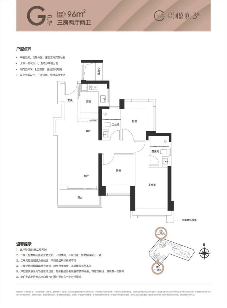 户型设计精致合理,空间利用率高,如83-87㎡的3房2厅2卫,设计为经典竖厅格局,客厅实测3.14米开间,LDKB一体化,S墙设计预留冰箱卡槽位,三开间朝南,3个卧室分别做到了主卧10.8㎡/次卧8.65㎡/次卧6.28㎡(实测面积,不含墙体),U型灵动式厨房,卫生间干湿分离,得房率约76-81%(不含赠送),西南朝向。
