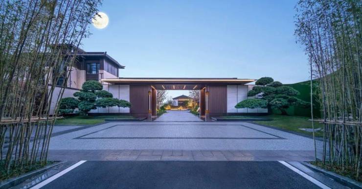 穿过竹林夹道,便是气势精致的门楼,金属格栅搭配景墙细节,处处透露匠心之感。