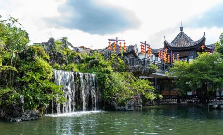 来到后花园,假山,水系,植物,处处流露出岭南风情。“园中小苑,遍植岭南佳果,迭泉小瀑,流水潺潺,春来虫喧蛙叫,夏日荔熟蝉鸣。”一派自然生态景象,怡人舒适。