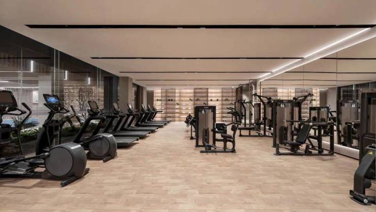 穿过一层展示空间,乘坐电梯到达负一层,你将见到四个区域:理疗区、瑜伽房、健身房、恒温泳池。