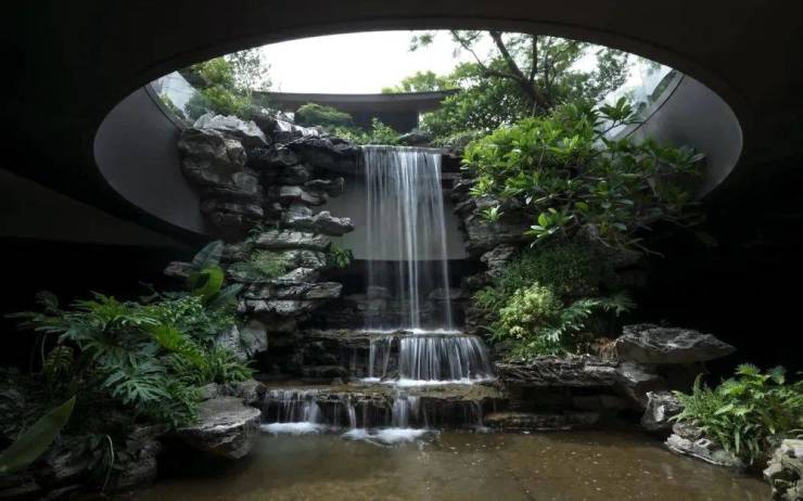 步入其中,对景流水墙、前庭、风雨连廊……庭院深深,步移景异,光影婆沙。