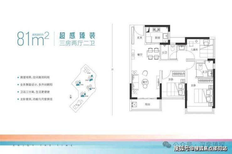 81㎡的3房2厅2卫,设计的是竖厅格局,餐客厅一体化,动静分区,客厅3.2米开间,分别做到了主卧13.3㎡/次卧7.83㎡/次卧6.9㎡(包含墙体飘窗),U型厨房,公卫三段式分离设计,得房率78.19%(不含赠送),阳台进深1.25米,有东南、正南或东北向。套内面积63.57㎡+赠送6.8㎡=实用70.37㎡,实际得房率86.56%。