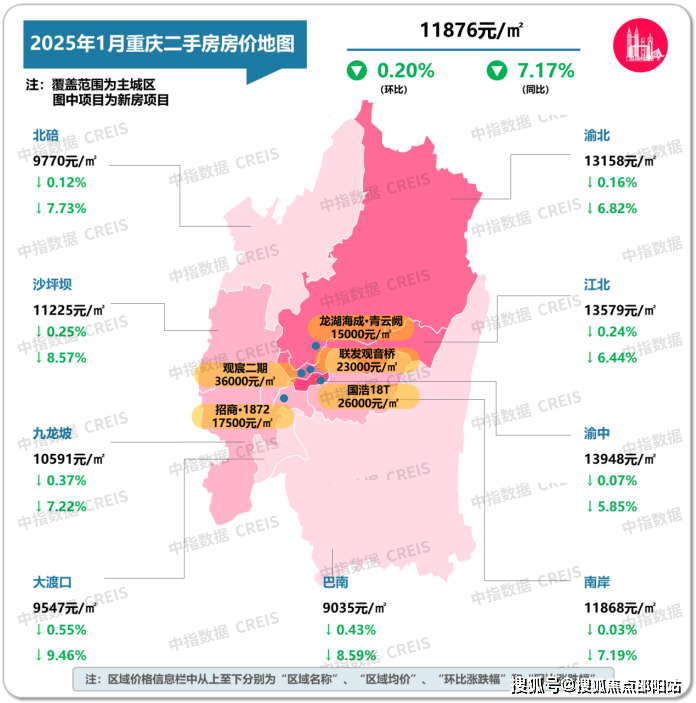 图:2025年1月重庆(主城区)各市辖区二手住宅挂牌均价及环同比数据来源:中指数据CREIS(点击查看)市场监测:https://www.cih-index.com