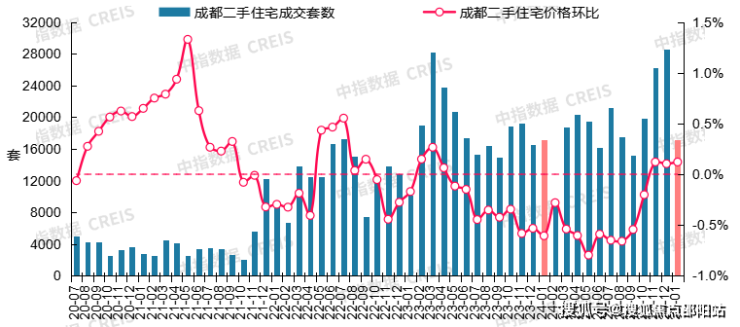 图:2020年7月至2025年1月成都二手住宅成交套数及二手住宅价格环比走势数据来源:中指数据CREIS(点击查看)市场监测:https://www.cih-index.com