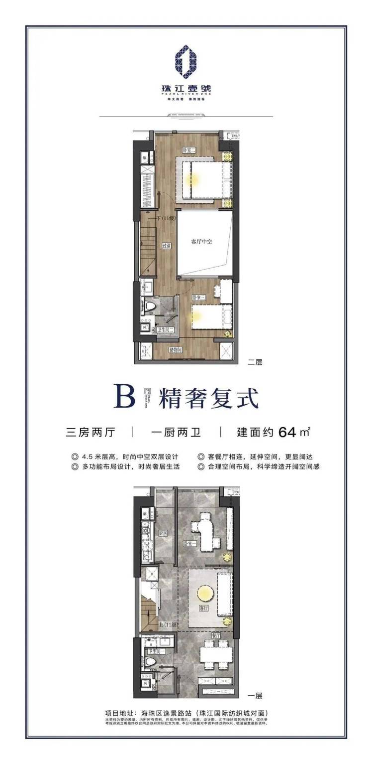 【项目概况】开发商:珠江投资集团物业公司:缦合物业,破亿豪宅同款物业占地面积:约3.7万㎡建筑面积:约31万㎡,LOFT空间约6.8万㎡LOFT层高:约4.5m中空挑高复式面积段:49-95㎡二至五房总户数:875套梯户比:10梯35户层数:共34层(仅25个标准层)拿地时间:2005年交楼时间:2023年6月(预计22年10月可交付)产权年限:50年装修:精装修【交通配套】 5站珠江新城,5站琶洲 11号线逸景路站正上,现场可以看到地铁站正紧锣密鼓施工中。11号线作为大环线,串联起天河、越秀、荔湾、海珠、白云五大中心区,预计将于2022年通车。 项目坐落于2000亿中大商圈之核,与珠江新城、琶洲两大城市CBD,共筑广州商业黄金三角。中大国际创新谷,依托中山大学、中国科学院南海研究所等前沿资源打造重大国际创新谷,将成为集合科研总部、科技孵化、商务配套功能于一体的高品质创新科技集聚区。未来,中大商圈将以中大国际创新谷的全新风貌展现在世界面前,成就比肩世界的“广州硅谷”。珠江壹號凭借其不可复制的核芯地理位置,将成为炙手可热的当红明星。大体量商业旗舰,城芯风向标除了地标的稀缺价值、地铁物业价值之外,珠江壹号还坐拥一站式高端配套等多重优势,万达广场、合生广场以及珠江壹号自带的7万㎡时尚MALL举步即达,汇集全球时尚娱乐休闲,高端餐饮美食,文体商务等全配套生活业态,开启万千精彩生活。