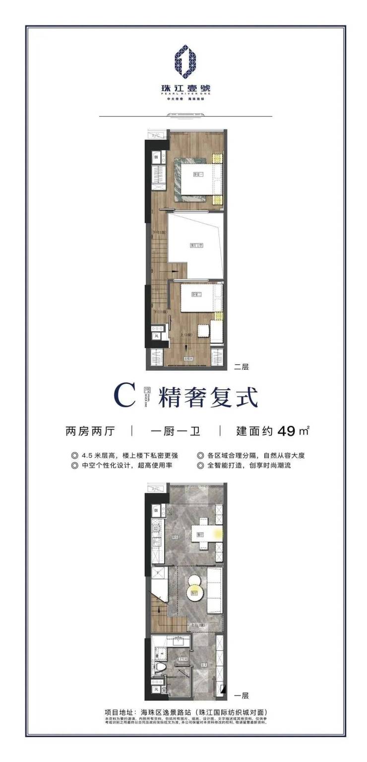 家住在公园旁 - 城市繁华一览无余约220米海珠新地标,天际视野,俯瞰一城繁华,与小蛮腰相互对望,同时举步即享城芯自然风光,同时拥有上涌果树公园、海珠国家湿地公园双重生态景观。上涌果树公园总面积达142公顷,大小相当于8个晓港公园,是海珠区最大的公园之一;海珠国家湿地公园,是广州第一个国家湿地公园,被誉为“南肾”。31万平方米城市地标综合体项目具有超甲级写字楼配套优势,写字楼标准层建面约2200-2500㎡,在售户型建面约127-285㎡,层高达到奢阔的4.2米,堪称天幕会客厅,是中大板块目前唯一的超甲级写字楼。珠江壹號,31万㎡城市地标级综合体,携220m超甲级写字楼落位中大商圈,目前中大板块中唯一地铁正上的超甲级写字楼。集超甲级写字楼、墅级奢居复式、约10万㎡商业旗舰于一体,享受全配套优质生活圈,满足居住、办公、购物休闲等一站式需求。金牌户型,宜居宜业宜投资珠江壹号主推49-95㎡时尚LOFT空间,4.5米层高,使用率非常高,买一层可享受两倍的奢阔空间。而且户型多样,总价可控,能满足各阶段的住房需求。