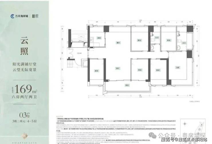 169㎡的6房2厅2卫,设计的是竖厅南北通透格局,独门独户,赠送私用公区走道,客厅4.15米开间,餐客厅分离设计,五开间朝南,U型厨房,公卫三段式干湿分离,得房率约100%(包含赠送),7.05米长的超大观景阳台约12.33m²主朝东南向。赠送面积约31.69m²。