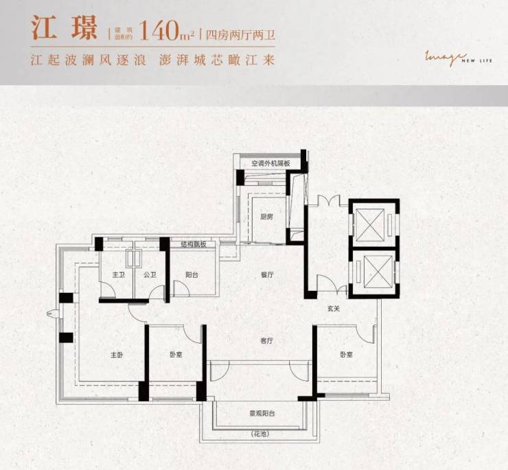 ③建面约140㎡:大四房两厅两卫,北向一线望江,稀缺板楼设计,专梯专户,尊享高贵