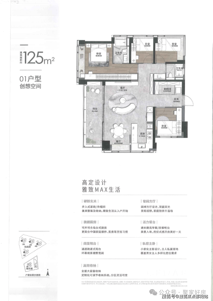 125㎡4房2厅2卫,设计的是客厅朝向,主卧朝西,1房朝北,1房东北,1房朝南,独立步入式衣帽间/家政间/储物间,接近50㎡两面采光景观大方厅,LDKB一体化豪宅设计,270度转角观景阳台,超6.5米跑道式阳台,可开可合岛台式厨房,早餐/西餐吧台,私密小家化设计主卧。