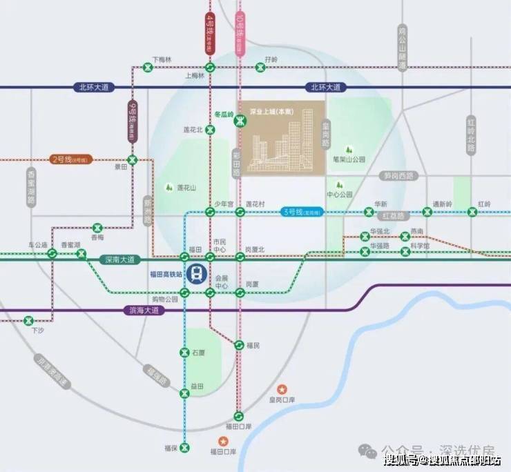 无缝接驳地铁10号线冬瓜岭站,纵享福田“一中枢、双口岸、四核心”枢纽体系,再造引桥匝道升级微循交通体系,高效互联湾区城市与全球资本。