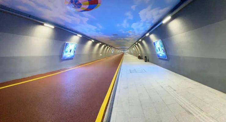 慢行隧道是珠海第一座独立设置慢行系统的隧道,也是现今国内最长的慢行景观隧道。隧道顶部的3D手绘,蓝天、白云连同飞鸟、热气球、航天器都延伸进了隧道内。来到隧道中段,长达50米、高4米的巨幕投影如画卷般铺展于两侧。伴随着音乐声,40个投影灯所投射出的海洋景象和珠海城市风光一一在眼前掠过,成为珠海新的热门打卡景点。