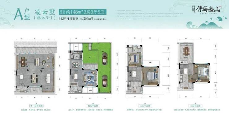 凌云墅A户型(北入户)建筑面积约148㎡,实际可用面积约266㎡(不计花园及露台)