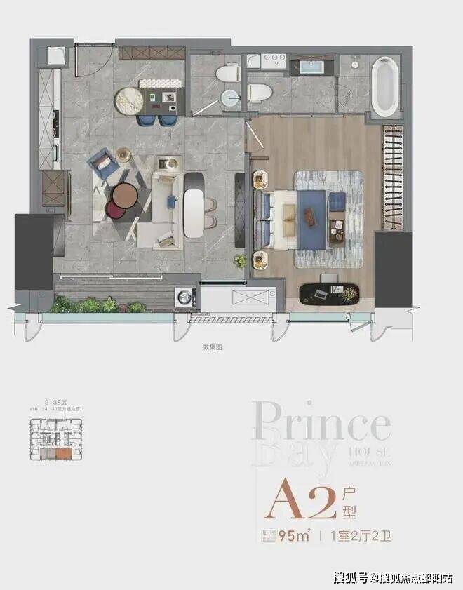 南向(9-38层) A2户型,95㎡ 1室2厅2卫,虽然卧室的衣柜空间少了,但是却却多了一个卫生间,还带浴缸!