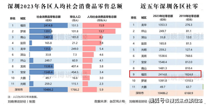 1、社会消费零售总额领先:2018年及2023年社会消费零售总额,福田片区消费力均位居前列,全市领先;