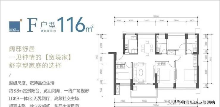 116㎡的4房2厅2卫,F户型,设计的是竖厅南北通透格局,餐客厅一体化设计,客厅3.8米开间,四开间朝南,4个卧室分别做到了主卧18.02㎡/次卧12.3㎡/次卧8.7㎡/次卧8.37㎡(包含墙体飘窗),都不用搭配飘窗做床,L型厨房,卫生间干湿分离,得房率约:88%(包含赠送),阳台主朝西南或东南向。