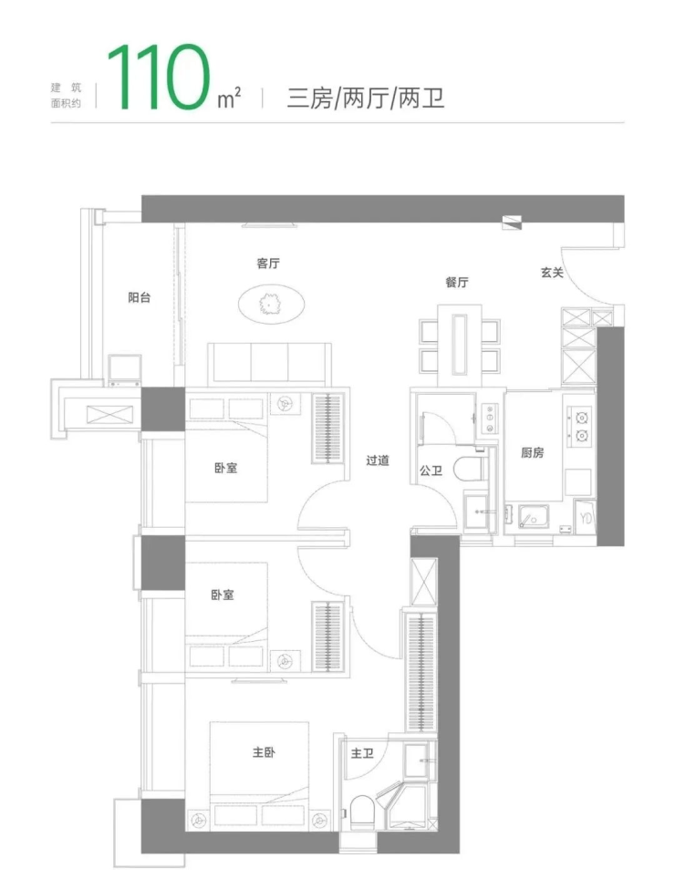 建面约110m²三房两厅两卫
