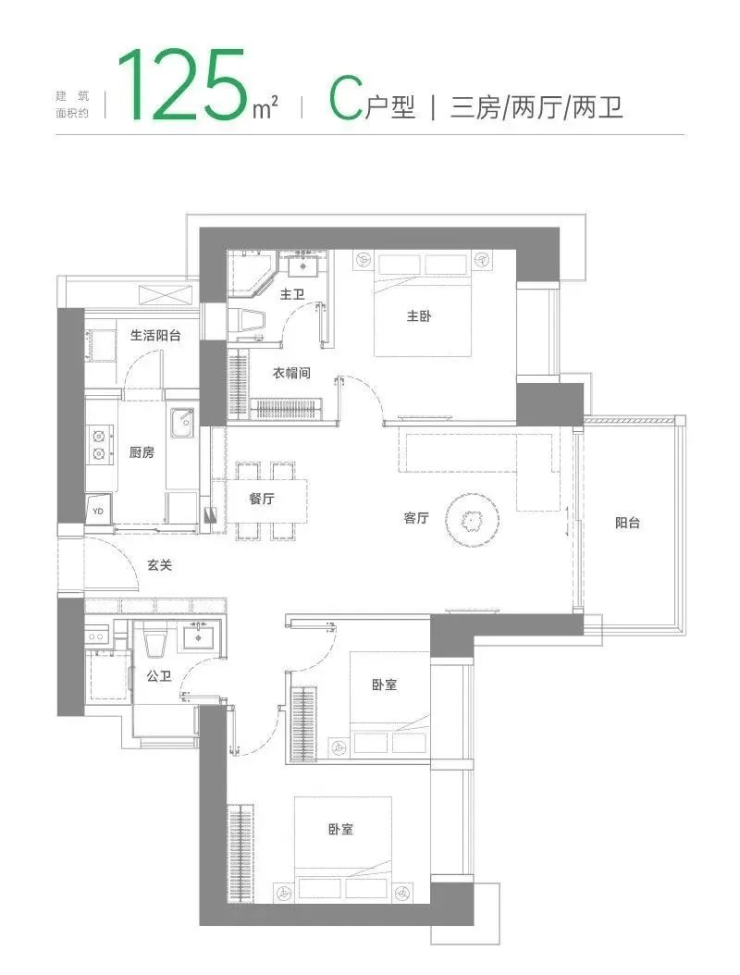 C户型 建面约125 m² 三房两厅两卫
