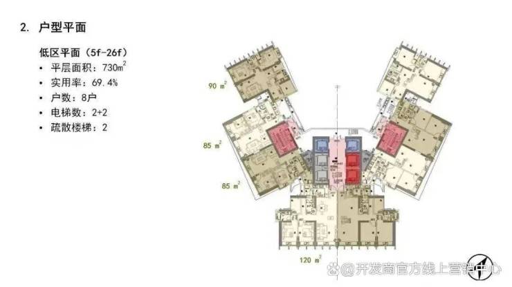 整个楼层是蝶形平面布局,板楼设计,实现每一户景观价值和通透价值最大化;